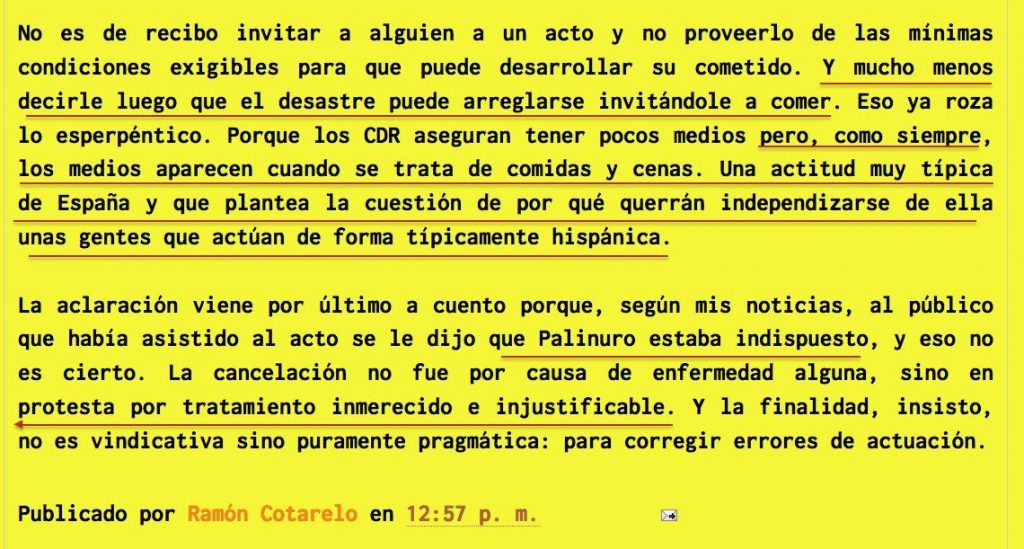 Esta «actitud», según Cotarelo, es «muy típica de España y que plantea la cuestión de por qué querrán independizarse de ella unas gentes que actúan de forma típicamente hispánica».