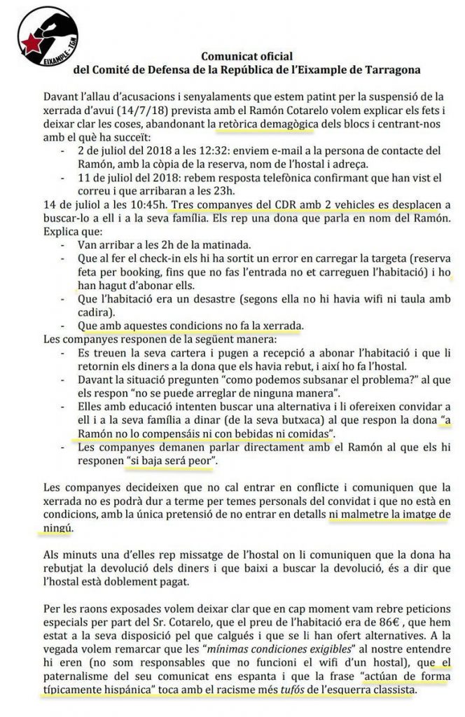 El autodenominado CDR organizador, el del Eixample de Tarragona, aseguran que el malestar de Cotarelo viene, entre otros motivos, porque en el hostal que le habían procurado no «tenía wifi ni mesa con silla».
