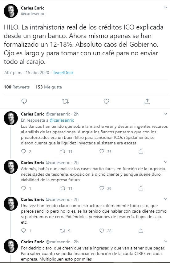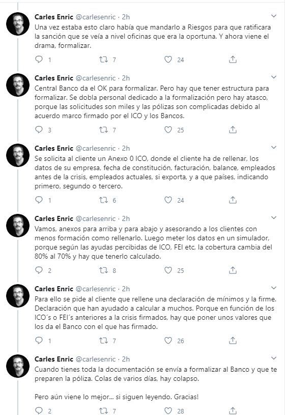 El popular tuitero constitucionalista Carles Enric, experto en temas concursales de empresas, ha difundido en su perfil un hilo en el que explica lo que define como «la intrahistoria real de los créditos ICO explicada desde un gran banco»