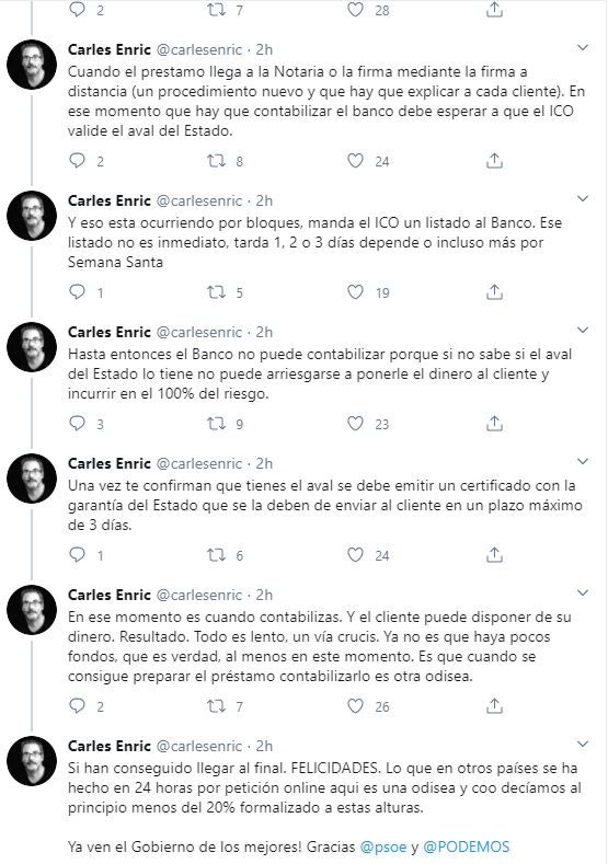 En el hilo va narrando los diferentes pasos y peripecias por los que pasan cualquier empresario que acuda a una entidad bancaria para solicitar la línea especial de crédito abierta por el gobierno destinada a paliar las consecuencias económicas de la epidemia del coronavirus.