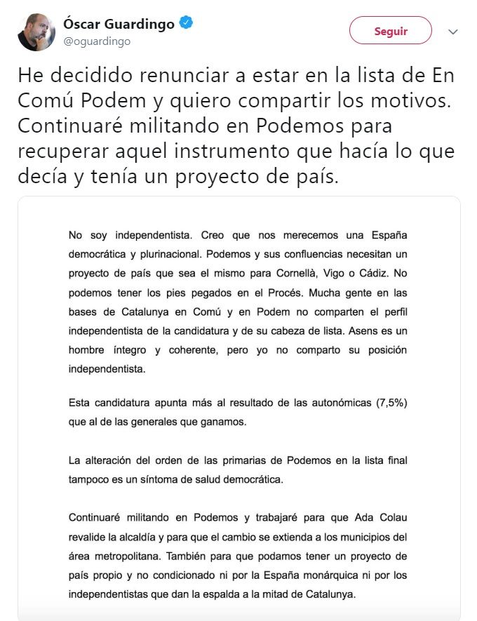 “Mucha gente en las bases de Catalunya en Comú y de Podemos no comparten el perfil independentista de la candidatura y de su cabeza de lista”, asegura Guardingo en un comunicado que ha publicado en su cuenta de twitter. Respecto a Asens, dice que “es un hombre íntegro y coherente, pero no comparto su posición independentista”.