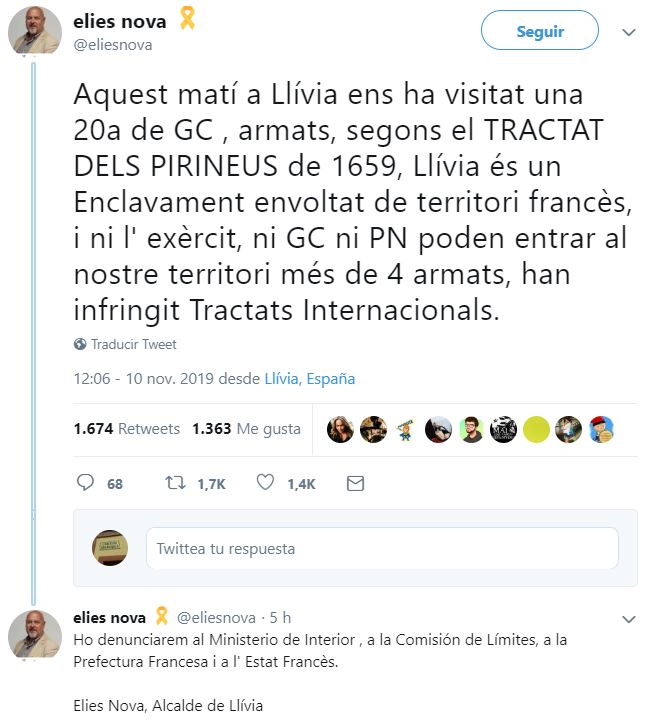 Elies Nova, el alcalde secesionista de Llívia (ERC) difundió en Twitter un mensaje según el cual España habría violado tratados internacionales. Llívia es un enclave español rodeado de territorio francés, unido al resto del país por una carretera.