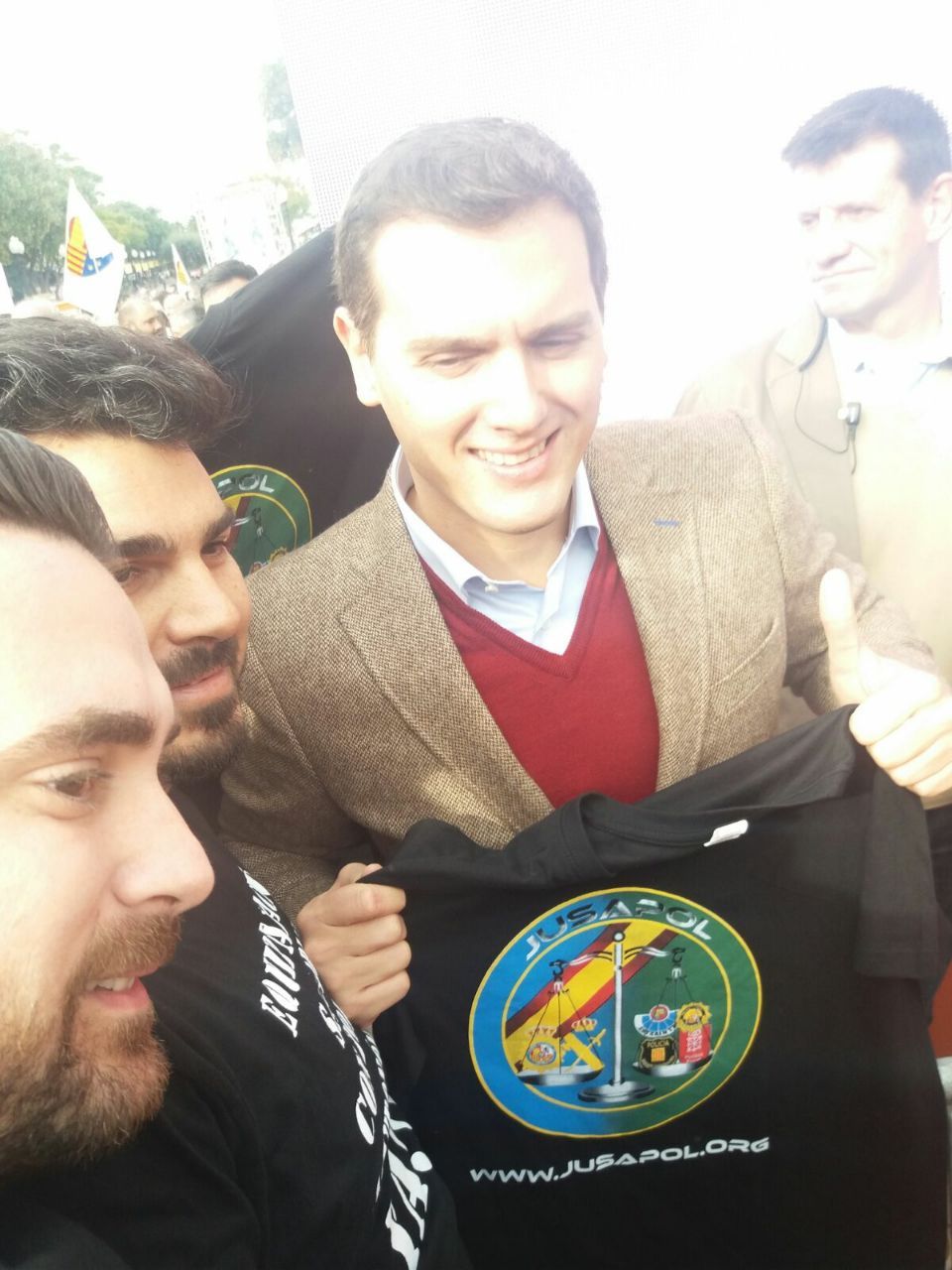 Ayer el líder de Cs, Albert Rivera, volvió a mostrar su apoyo a los policías nacionales y guardias civiles que acudieron al acto de Cs en Tarragona, el presidente de Ciudadanos se fotografió con los agentes y posó con una camiseta que reivindicaba dicha equiparación salarial.