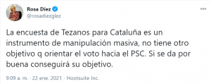 «La encuesta de Tezanos para Cataluña es un instrumento de manipulación masiva, no tiene otro objetivo que orientar el voto hacia el PSC. Si se da por buena conseguirá su objetivo«, ha sentenciado en Twitter Rosa Díez.