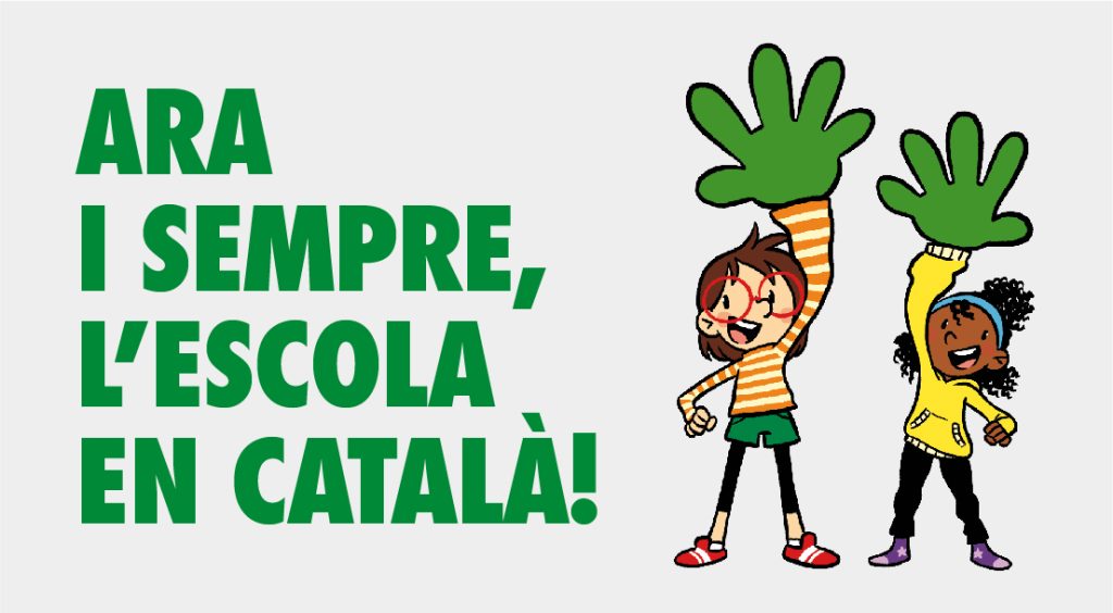 Con la pancarta del lema oficial de Som escola, una plataforma integrada por un buen número de entidades separatistas – Òmnium, ANC, Plataforma per la Llengua, SEPC, FNEC, etc -, en la puerta de muchos centros escolares es difícil que haya profesores que luego pidan relajar los criterios lingüísticos de la Generalitat, ahora en manos del PSC. El lema «Ara i sempre, l’escola en català» deja claro que no hay lugar para el bilingüíismo y, por lo tanto, para el respeto lingüístico para los niños y profesores castellanoparlantes.