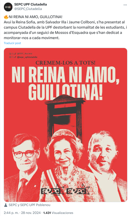 A veces, de forma colateral, meten en el mismo saco a la Monarquía con Salvador Illa y Jaume Collboni, a pesar de la sumisión del PSC a los postulados del independentismo. Un ejemplo lo tenemos en la reciente visita de la Reina Sofía al campus Ciutadella de la Universidad Pompeu Fabra, en el circuló una imagen con una guillotina y la imagen de la Reina emérita junto a la del alcalde de Barcelona y el presidente de la Generalitat. Fue difundida por el principal sindicato estudiantil separatista.