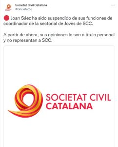 Todos estos hechos lamentables le han costado el puesto a Joan Sáez en Societat Civil Catalana. La entidad constitucionalista informó este pasado jueves a través de su cuenta de Twitter que Sáez era suspendido — que no cesado — en sus funciones. Una rápida respuesta de SCC anta la lamentable actitud de su hasta ayer coordinador de jóvenes.