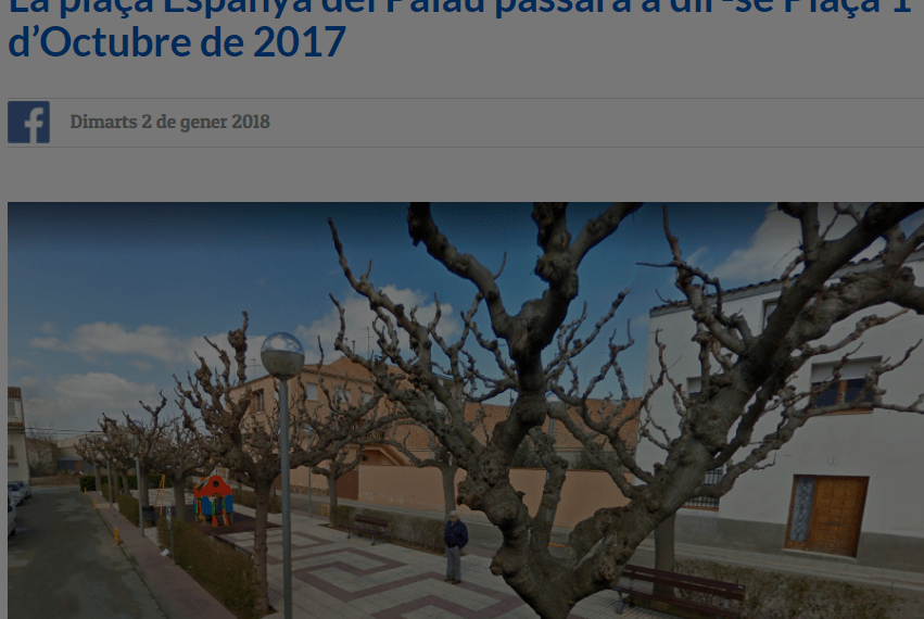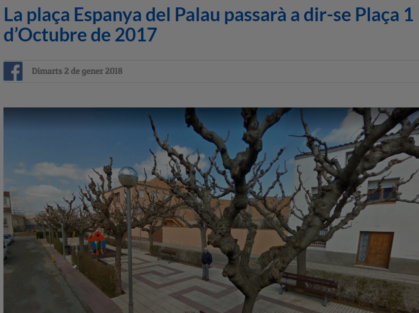El pleno municipal de Palau d’Anglesola, una población de unos dos mil habitantes a pocos kilómetros de Lleida, ha decidido conseguir unos minutos de gloria publicitaria cambiando el nombre de la Plaza de España de la localidad por el de «1 de octubre de 2017», en referencia a la fecha en el que se celebró la consulta ilegal que sirvió de coartada a la aún más ilegal Declaración Unilateral de Independencia en el Parlament.