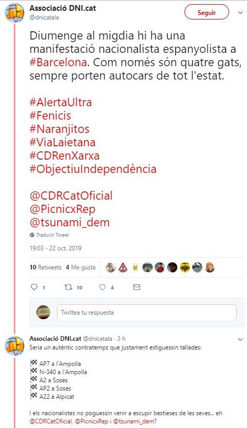 Este colectivo ha difundido en Twitter que «domingo al mediodía hay una manifestación nacionalista española en Barcelona. Como solo son cuatro gatos, siempre traen autocares de todo el Estado».