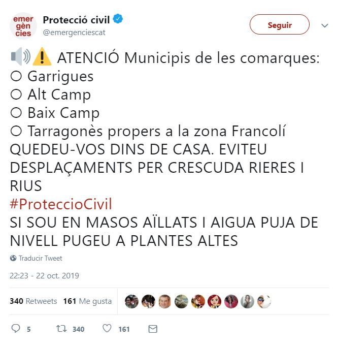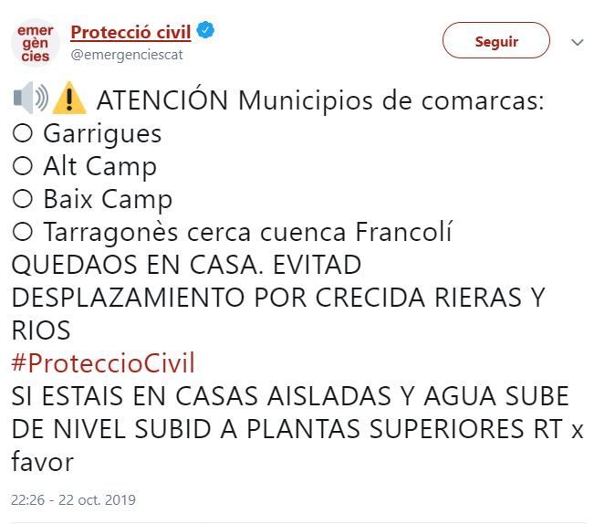 La cuenta de Twitter @emergenciescat en la red social Twitter, que es de la Dirección General de Protección Civil de la Generalitat de Catalunya difundió mensajes de alerta para dar consejos ante las lluvias que cayeron el martes por la noche en buena parte del territorio catalán.