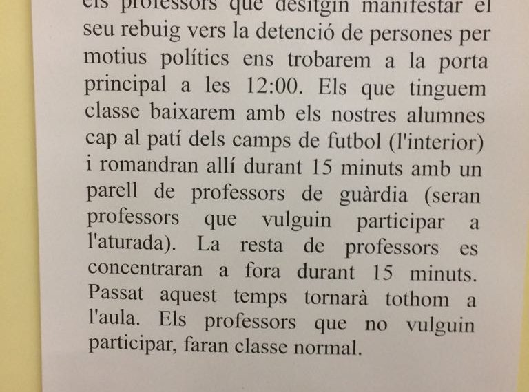 En ellos se detallan cómo se ha de actuar, cómo los profesores que deseen participar en la concentración de protesta han de sacar a sus alumnos de clases y dejarlos con un par de profesores que los vigilen. Eso sí, se ‘permite’ que los profesores que «no quieran participar» puedan hacer «clase normal».