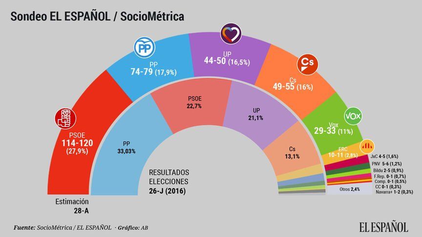 El del digital El Español (Sociométrica) da también como ganador a los socialistas (114-120 escaños), seguido de Partido Popular (74-79 escaños). El resto de partido tendrían los siguientes resultados: Ciudadanos (49-55), Podemos (44-50), VOX (29-33), ERC (10-11), PNV (5-6), JxCAT (4-5), Bildu (2), Navarra+ (1-2), Front Republicà (0-1), Compromís (0-1), CC (0-1).