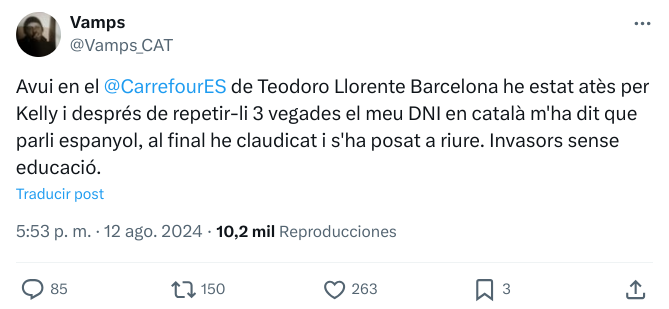 “Hoy en el @CarrefourES de Teodoro Llorente Barcelona he sido atendido por Kelly y después de repetirle 3 veces mi DNI en catalán me ha dicho que hable español, al final he claudicado y se ha echado a reír. Invasores sin educación”, ha denunciado una usuaria en la red social X.