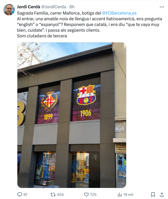 “Sagrada Familia, calle Mallorca, tienda del @FCBarcelona_es Al entrar, una amable chica de lengua y acento latinoamericano, ¿nos pregunta “english” o “español”? Respondemos que catalán, y nos dice “que te vaya muy bien, cuidate». Somos ciudadanos de tercera”, señalaba un usuario de X.