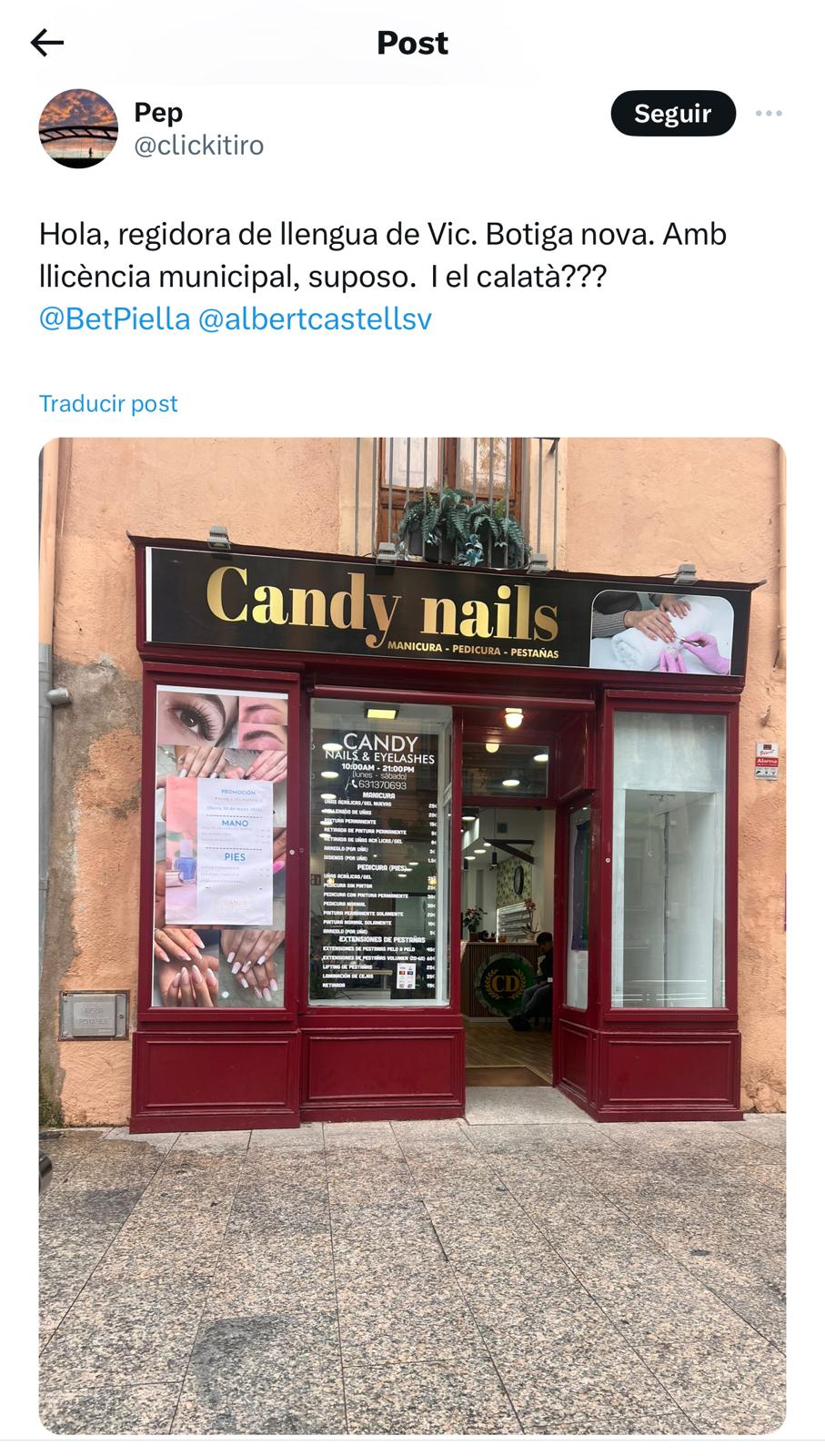 El último ejemplo lo hemos vivido en Vic, donde un usuario de X ha señalado un comercio de nueva apertura por estar rotulado en castellano. El post se ha hecho viral y la concejal de lengua catalana del consistorio ya ha amenazado con multa al comercio en cuestión a través de sus redes sociales.