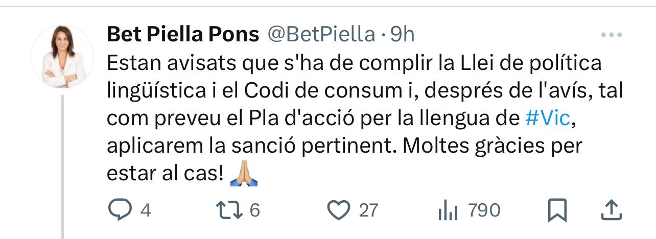 “Están avisados de que debe cumplirse la Ley de política lingüística y el Código de consumo y, tras el aviso, tal y como prevé el Plan de acción por la lengua de #Vic, aplicaremos la sanción pertinente. ¡Muchas gracias por estar al caso!”, ha afirmado Bet Piella, concejal del Ayuntamiento de Vic, quien, además, como se puede leer, da las gracias a los chivatos. Tremendo.