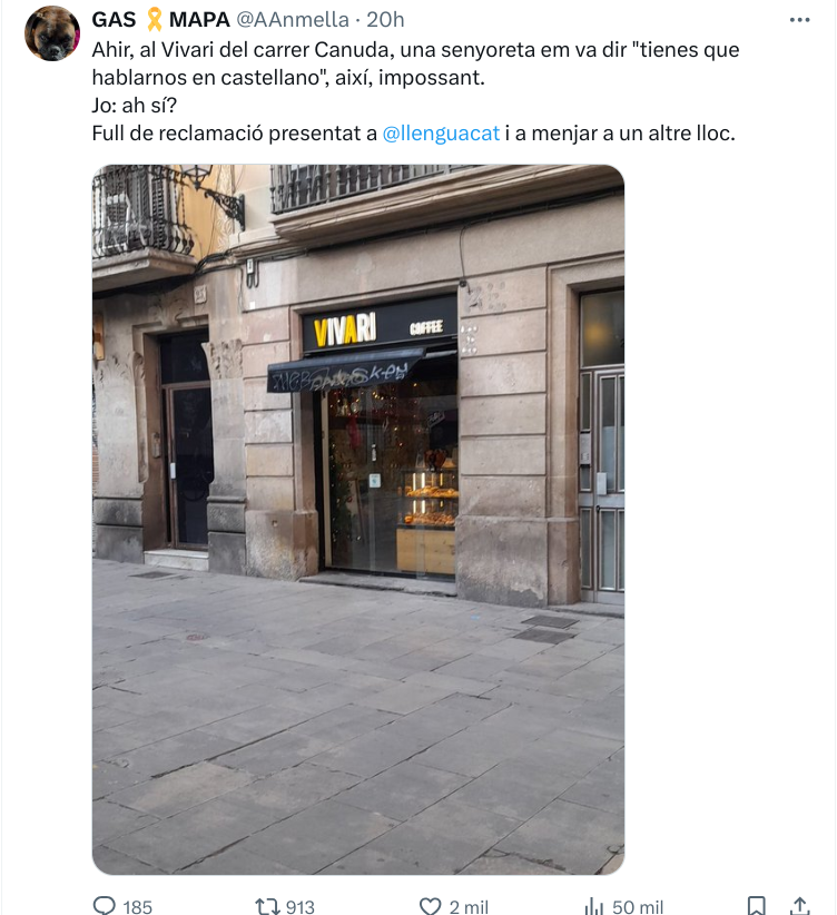 Buceando por las redes sociales independentistas, nos hemos topado con un nuevo señalamiento a los trabajadores de una cafetería en Barcelona por el simple hecho de hablar en español. Es el modus operandi que utilizan los ‘hooligans’ para imponer el catalán en la sociedad. El mensaje se ha hecho viral en las redes sociales. Una clara demostración del clima que se vive en la Cataluña gobernada por los socialistas.