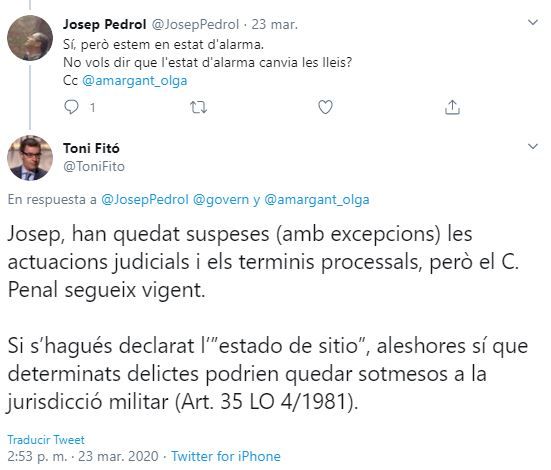 Cuando otro tuitero le pregunta sobre si «el estado de alarma cambia las leyes», Fitó argumenta que «el Código Penal sigue vigente» y que «si se hubiera declarado el ‘estado de sitio’, entonces sí que determinados delitos podrían quedar sometidos a la jurisdicción militar».