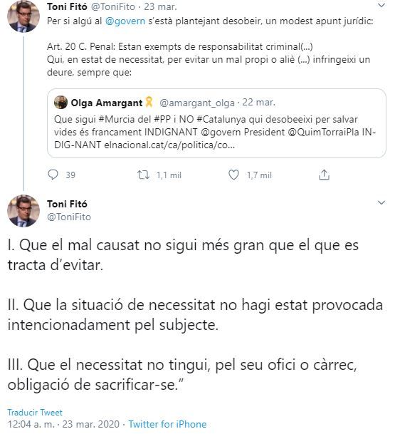 Fitó, como consejo al Govern por si decide desobedecer, cita el artículo 20 del Código Penal de la siguiente manera: «Están exentos de responsabilidad criminal (…) quién, en estado de necesidad, para evitar un mal propio o ajeno (…) infrinja un deber, siempre que: 1. Que el mal causado no sea más grande que el que se trata de evitar. 2. Que la situación de necesidad no haya estado provocada intencionadamente por el sujeto. 3. Que el necesitado no tenga, por su oficio o cargo, obligación de sacrificarse».