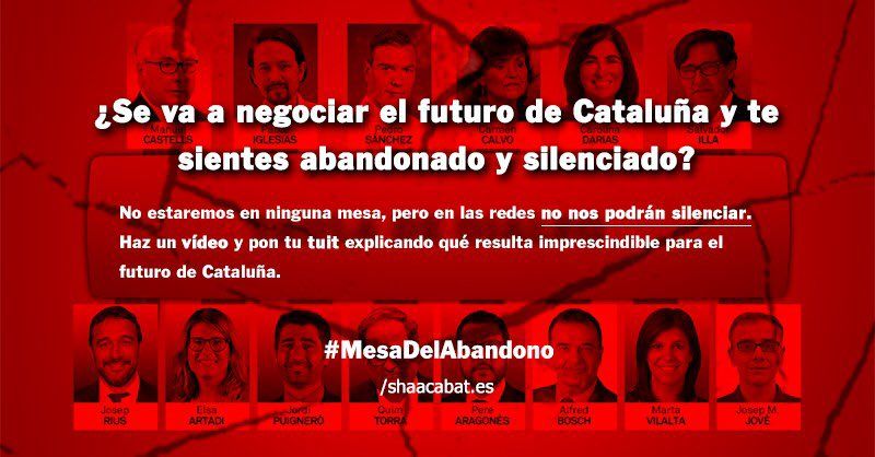En este sentido los jóvenes de S’Ha Acabat! han lanzado una campaña en las redes sociales para que los catalanes expliquen en un vídeo cuáles son las necesidades que quieren los catalanes que sean atendidas por el gobierno central con la etiqueta #MesaDelAbandono