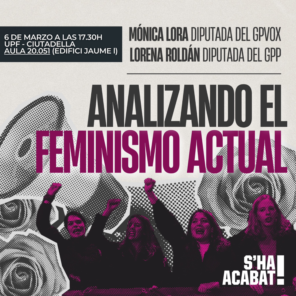 La asociación juvenil constitucionalista ‘S’ha Acabat!’ organiza el 6 de marzo el coloquio «Analizando el feminismo actual» a las 17:30 en el Campus Ciutadella de la Universidad Pompeu Fabra (Edificio Jaume I), en el aula 20.051.