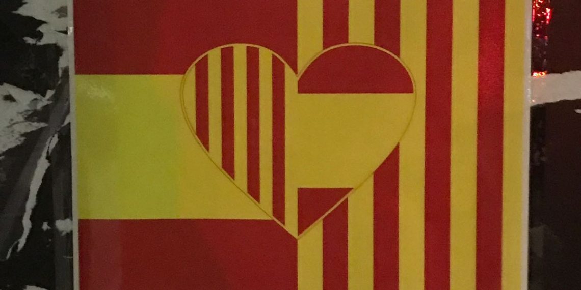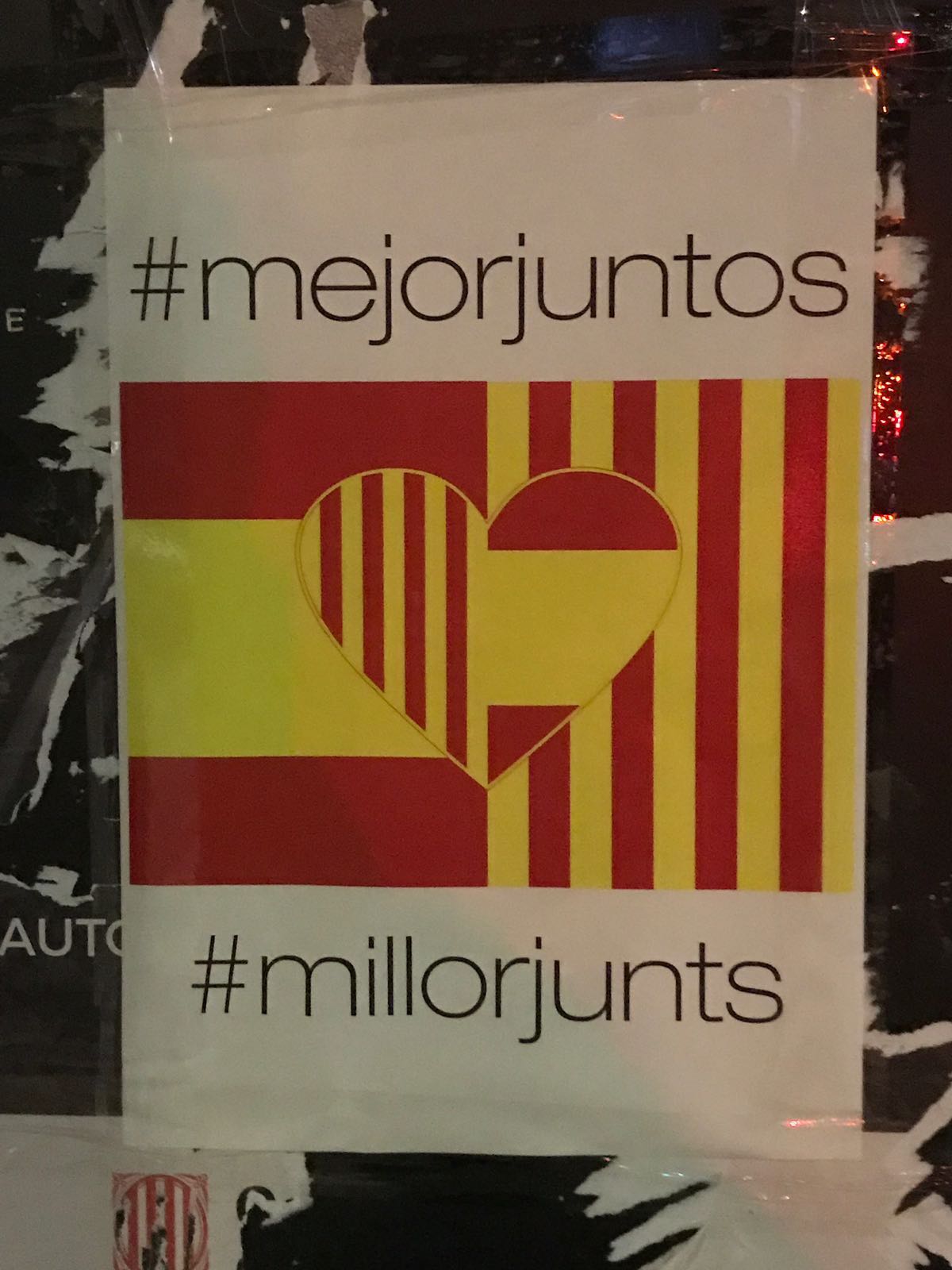 La enganchada popular de 10.000 pegatinas en diversas localidades de Cataluña que se ha realizado no ha sido la única campaña que se ha realizado en las últimas horas. La localidad de Mataró, situada a unos 30 kilómetros de Barcelona, ha amanecido con seiscientos carteles, también con los colores de la bandera rojigualda y la ‘senyera’ y el lema «#millorjunts», pegados en las principales calles de la ciudad.