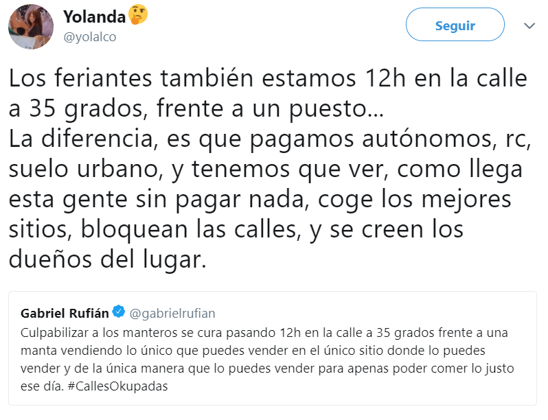 «La diferencia, es que pagamos autónomos, rc, suelo urbano, y tenemos que ver, cómo llega esta gente sin pagar nada, coge los mejores sitios, bloquean las calles, y se creen los dueños del lugar», le espetó por twitter a Rufián.