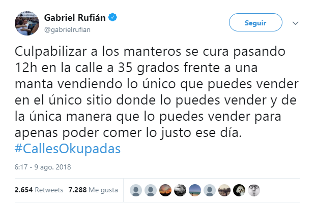 Ahí Rufián escribió un tuit con el siguiente mensaje, «culpabilizar a los manteros se cura pasando 12h en la calle a 35 grados frente a una manta vendiendo lo único que puedes vender en el único sitio donde lo puedes vender y de la única manera que lo puedes vender para apenas poder comer lo justo ese día«.