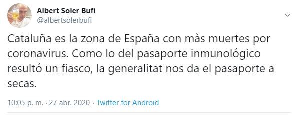 «Cataluña es la zona de España con màs muertes por coronavirus. Como lo del pasaporte inmunológico resultó un fiasco, la Generalitat nos da el pasaporte a secas«, comentó Soler sobre el intento del gobierno autonómico de implantar un documento, impulsado por el Dr. Oriol Mitjà, en el que se informaría del estado inmunológico, el estado de infección y la exposición de riesgo de cada ciudadano.