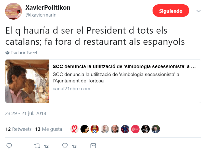 También ha denunciado en redes sociales esta exclusión de miembros de Societat Civil Catalana del restaurante, cuyo nombre no ha salido a la palestra.