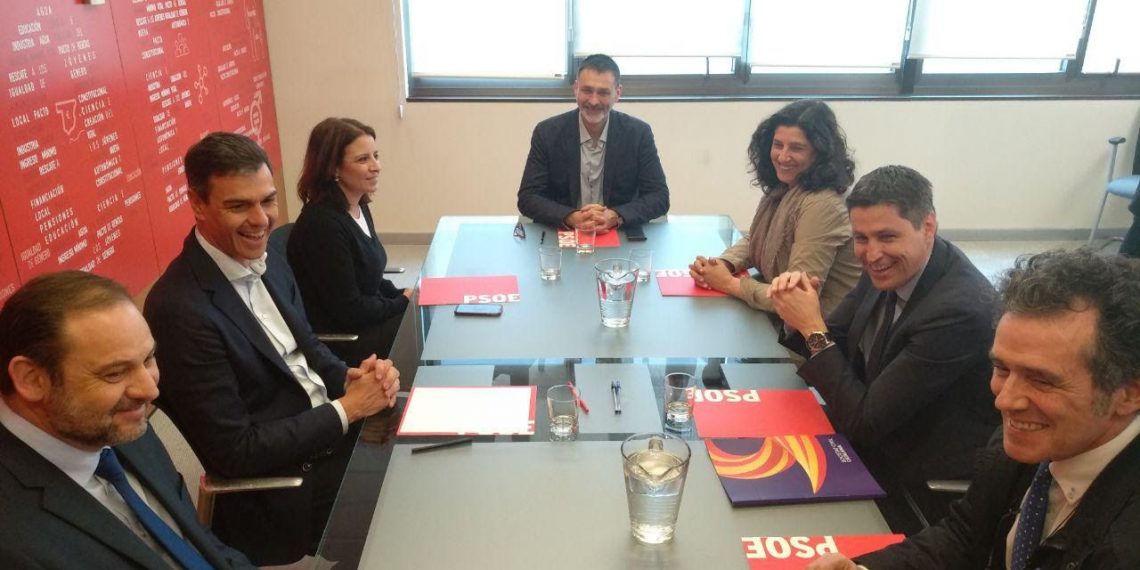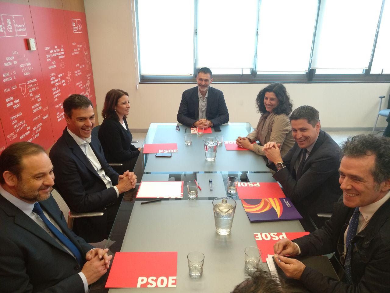 El presidente de Societat Civil Catalana, José Rosiñol, los vicepresidentes de la entidad, Álex Ramos, Miriam Tey y Óscar Uceda y el vocal de la Junta Directiva, Manuel Gómez Acosta, se han reunido este miércoles con el secretario general del PSOE, Pedro Sánchez, la vicesecretaria general de partido, Adriana Lastra, y el secretario de organización de la formación, José Luis Abalos.