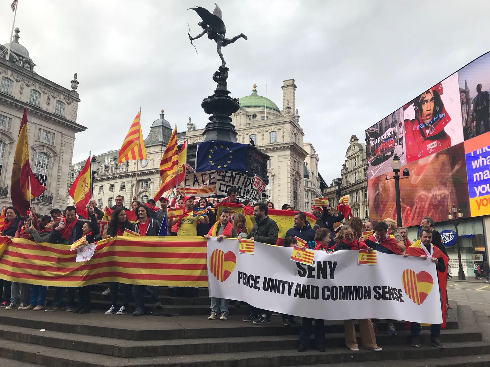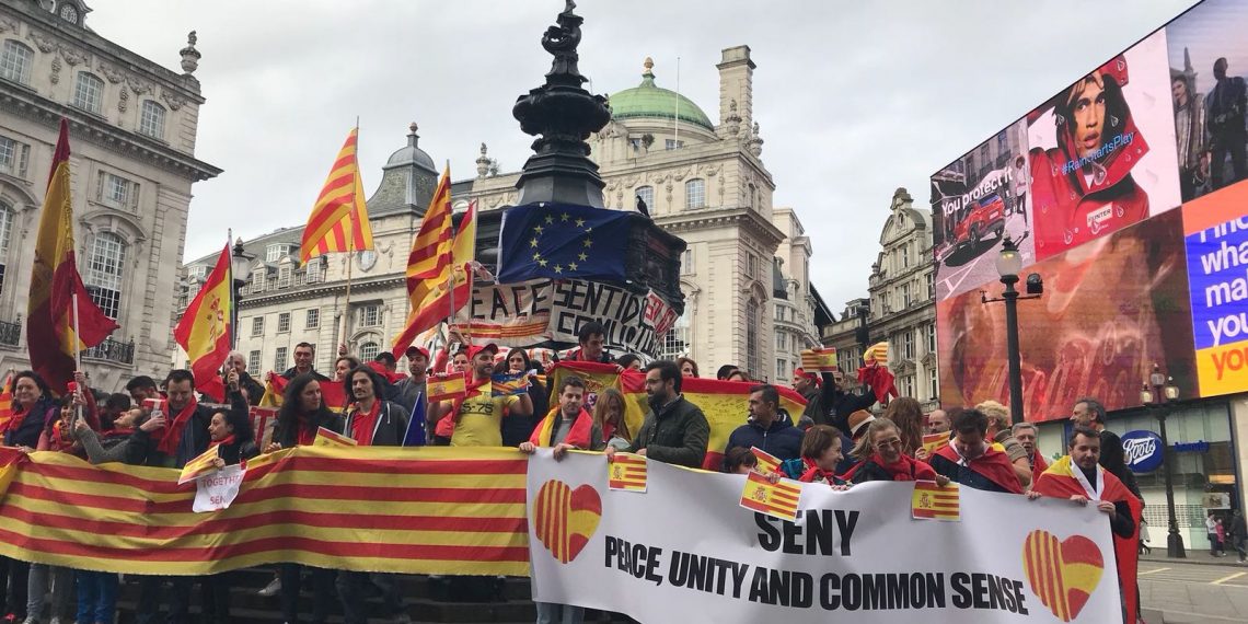 La sección de Societat Civil Catalana en el Reino Unido ha organizado una concentración en Londres de apoyo a la gran manifestación constitucionalista que se ha celebrado en Barcelona este mediodía bajo el lema «Cataluña es de todos».