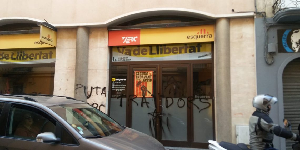 Un ejemplo de la tensión generada en el mundo secesionista son las pintadas que han aparecido en la sede de los republicanos en la localidad gerundense de Figueras.