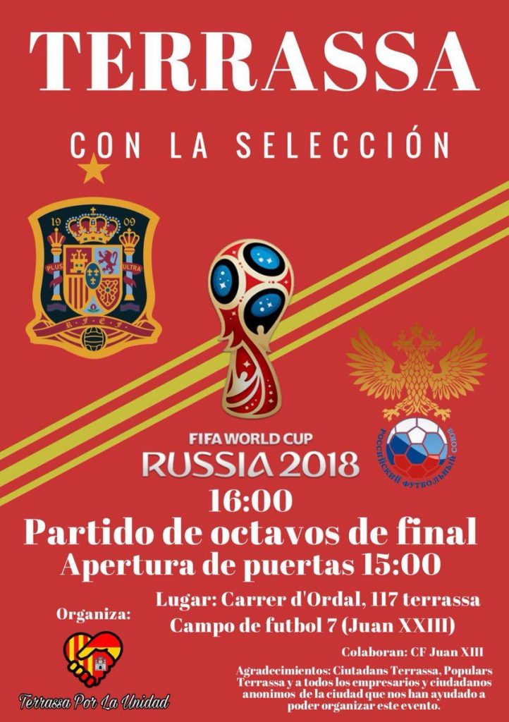 Terrassa por la Unidad monta este domingo una pantalla gigante para que los aficionados que lo deseen puedan seguir en un ambiente festivo y de apoyo a la selección nacional el España – Rusia de octavos de final del Mundial de fútbol.