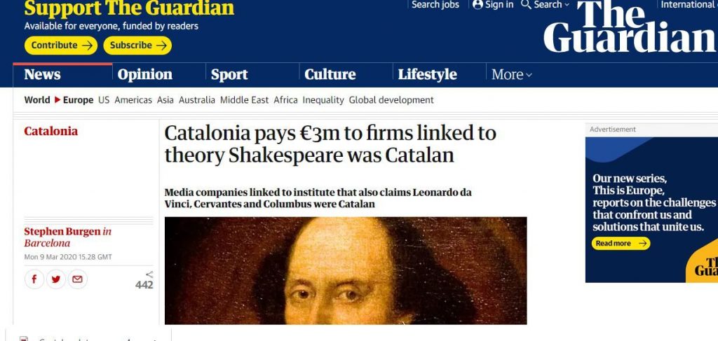 El diario británico The Guardian publica en su edición de este lunes que la Generalitat se gastó «tres millones de euros en subvenciones a empresas de medios estrechamente ligadas con una entidad que defiende que Shakespeare, Cervantes y Colón -entre otros- eran catalanes».