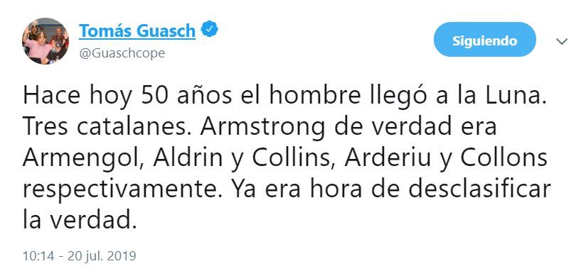 «Hace hoy 50 años el hombre llegó a la Luna. Tres catalanes. Armstrong de verdad era Armengol, Aldrin y Collins, Arderiu y Collons respectivamente. Ya era hora de desclasificar la verdad», afirmó Guasch, con buen humor.