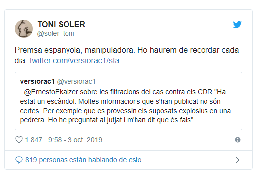 El presentador de TV3, Toni Soler, ha asegurado a través de su cuenta de Twitter que la prensa española es «manipuladora«, comentando una información del periodista Ernesto Ekaizer.