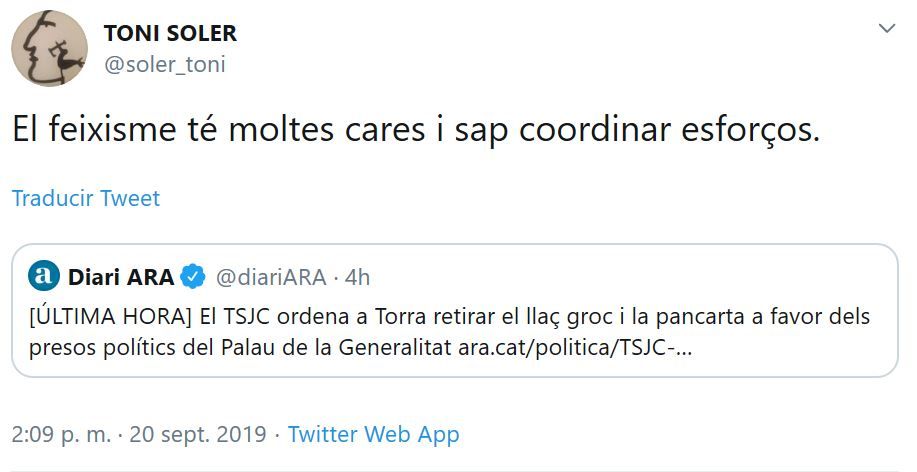 El comentario de Soler sobre esta decisión del Tribunal Superior de Justicia de Cataluña es «el fascismo tiene muchas caras y sabe coordinar esfuerzos».