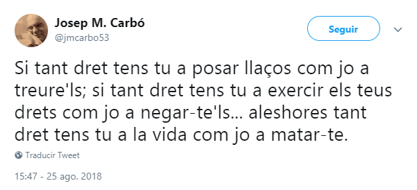 El filósofo Josep Maria Carbó dijo que «si tanto derecho tienes tú a poner lazos como yo a quitarlos, si tanto derecho tienes tú a ejercer tus derechos como yo a negártelos… entonces tanto derecho tienes tú a la vida como yo a matarte».