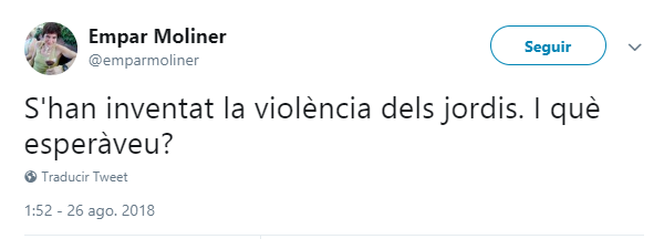 Y la escritora y colaboradora habitual de TV3 y Catalunya Ràdio Empar Moliner comentó que «se han inventado la violencia de los Jordis. ¿Qué esperabáis?»