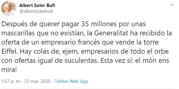 «Después de querer pagar 35 millones por unas mascarillas que no existían, la Generalitat ha recibido la oferta de un empresario francés que vende la torre Eiffel. Hay colas de, ejem, empresarios de todo el orbe con ofertas igual de suculentas. Esta vez sí: el món ens mira!», ha dicho Soler en su perfil de Twitter.