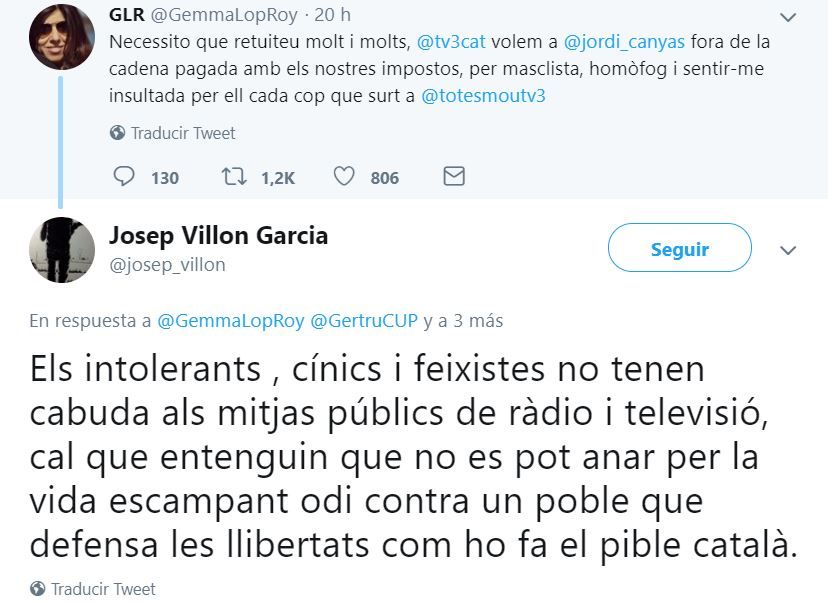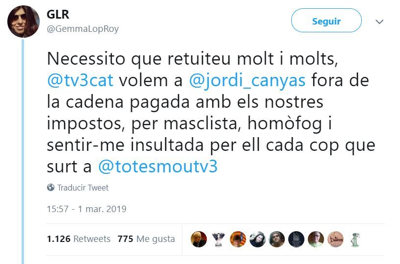 [Necesito muchos y muchos retuits, TV3 queremos a Jordi Cañas fuera de la cadena pagada con nuestros impuestos, por machista, ‘homofógo’ [sic] y sentirme insultada por él cada vez que sale en Tot es mou]
