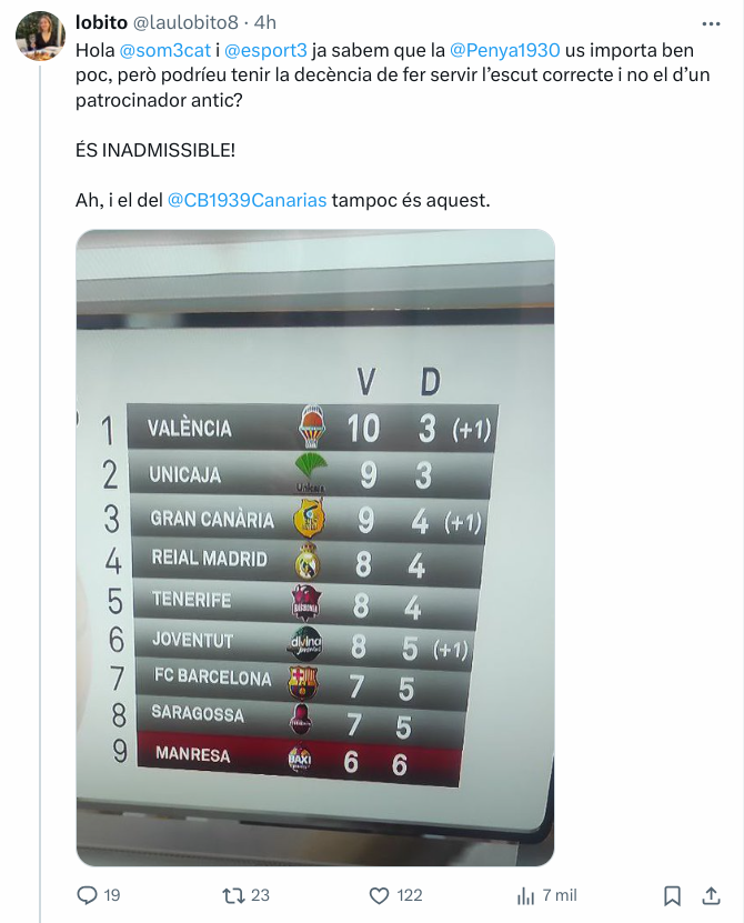 “Hola @som3cat y @esport3 ya sabemos que la @Penya1930 os importa poco, pero ¿podría tener la decencia de utilizar el escudo correcto y no el de un patrocinador antiguo? ¡ES INADMISIBLE! Ah, y el del @CB1939Canarias tampoco es este”, ha denunciado un usuario de X.