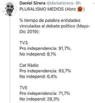 Este pasado martes gracias al trabajo del consejero del CAC Daniel Sirera conocíamos negro sobre blanco y con datos en la mano, lo que ya sospechábamos, y es el desproporcionado trato de favor que recibe el independentismo en los medios de comunicación públicos de Cataluña.