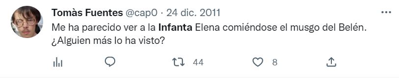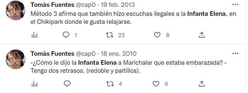 Otro tuit, presuntamente cómico, fue el 18 de abril de 2012: «El Rey se disculpa: Lo siento mucho. Me he equivocado. No volverá a ocurrir. Está hablando de la infanta Elena, no?». Y otro fue el siguiente: «Me ha parecido ver a la infanta Elena comiéndose el musgo del Belén. ¿Alguien más lo ha visto?». Tomás Fuentes es un humorista que es conocido por sus simpatías con el independentismo catalán.