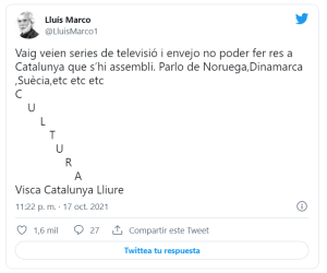 «Voy viendo series de televisión y envidio no poder hacer nada en Catalunya que se parezca. Hablo de Noruega, Dinamarca, Suecia, etc etc etc» y acaba con un grito independentista: «¡Viva Catalunya Libre«.