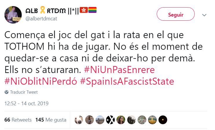 También ha asegurado que «comienza el Tsunami que ha de hacer caer el Reino de España. ¡No nos paremos!», y ha acompañado el texto de una fotografía de una serie de personas con una pancarta que dice «Contra la sentencia. Tsunami democràtic».