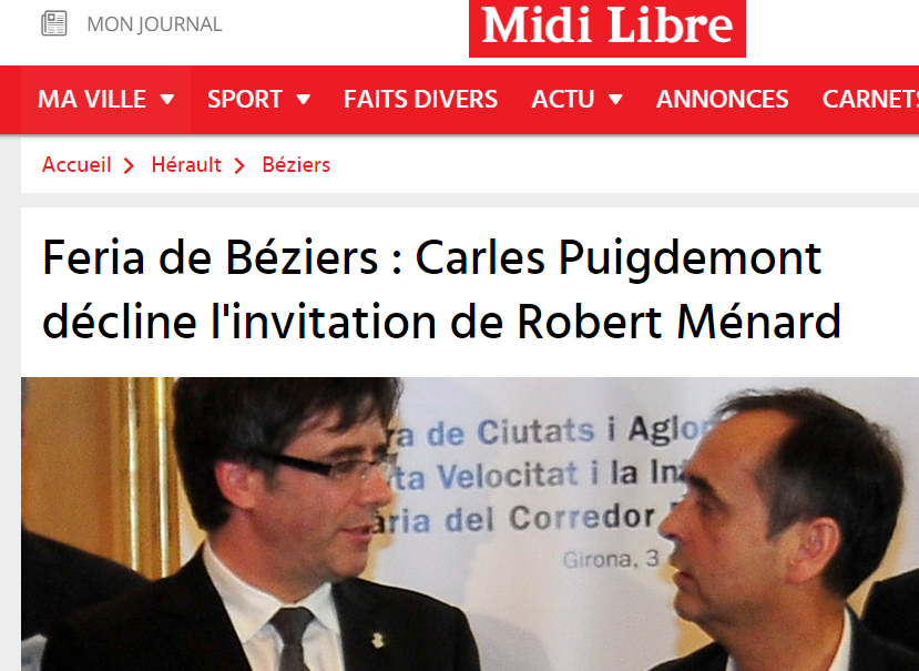El alcalde ultraderechista de la localidad francesa de Béziers, Robert Ménard, ha invitado a Carles Puigdemont a su ciudad para dar una conferencia durante los festejos estivales de la «Feria» de esta localidad.