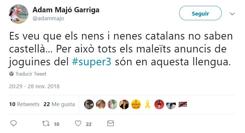 Dijo que «se ve que los niños y niñas catalanes no saben castellano…». Y añadió, como ejemplo que «por eso todos los malditos anuncios de juguetes del Club Súper 3 son en esta lengua«, dejando entrever, por la virulencia de la expresión, su malestar porque dichos anuncios no fueran en catalán.