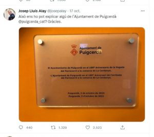 Este martes os traemos un nuevo ejemplo, Josep Lluís Alay es íntimo amigo del prófugo Carles Puigdemont, y a través de sus redes sociales ha montado en cólera al ver un cartel del Ayuntamiento de Puigcerdà en castellano y catalán.